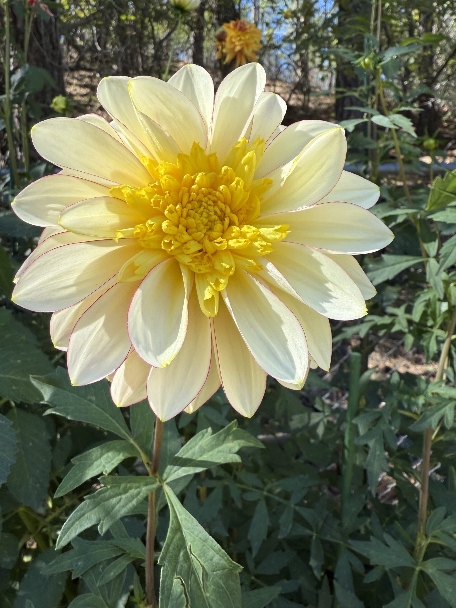 Creamy petals with cranberry edges – fluffy yellow center