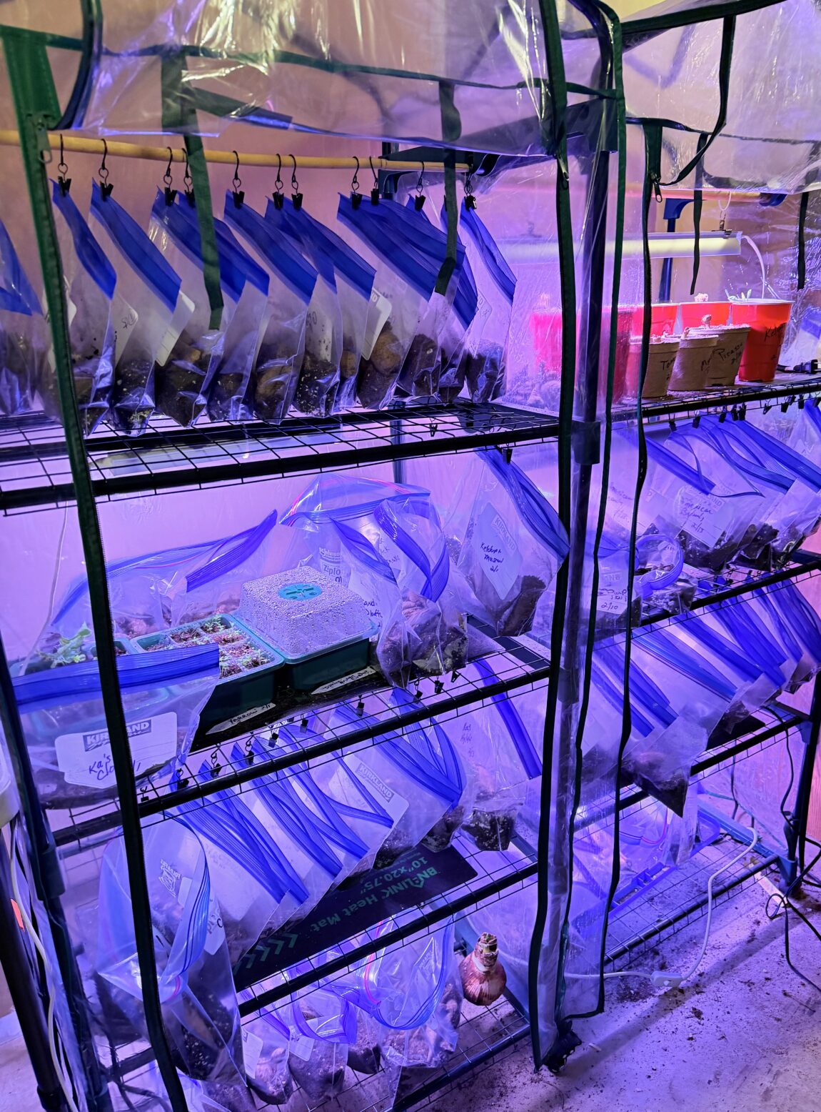 Dahlias actually don’t need light, until they sprout, so I put my baggies on shelves without lights, until the sprout develops. And I usually run my lights 12-16 hours a day after they have sprouted and for my other early seed starts – the same with the heat mats. It generally stays around 60-70 degrees inside their little plastic home. I bought these on Amazon and will attach a link, if you are interested. It’s worked well for me the last several years.
